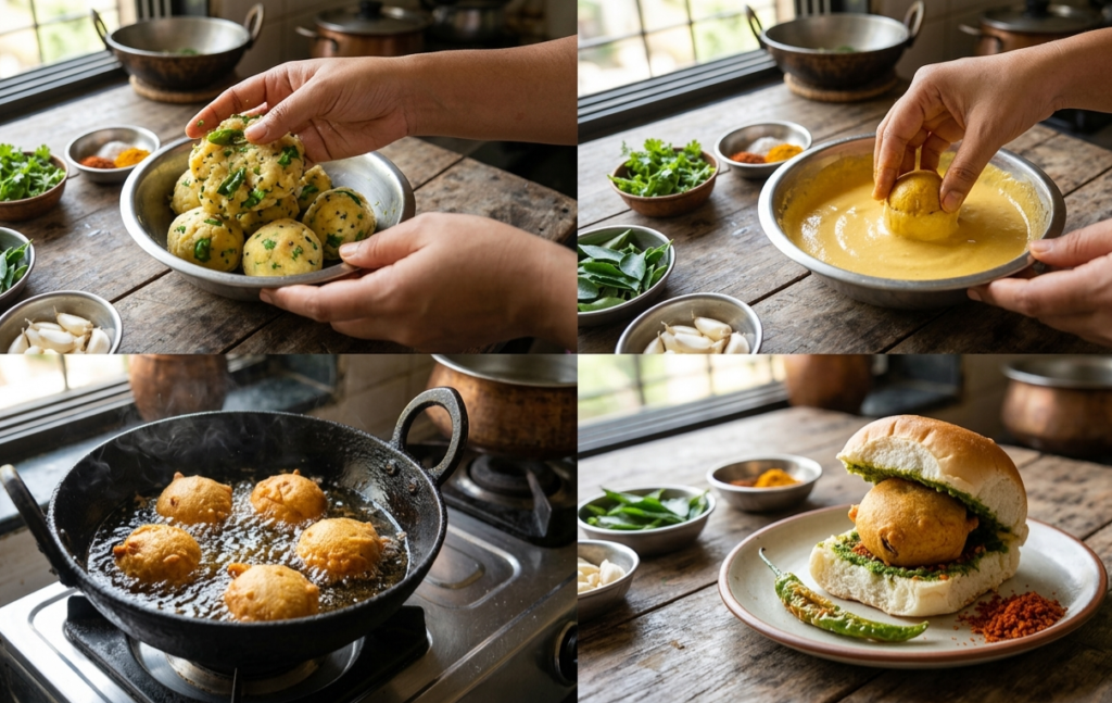 - Assembling the Vada Pav: * Take a fresh Pav (bread bun) and slice it halfway.