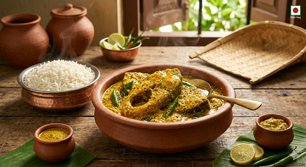 🥘 Main Course | 🐟 Non-Veg (Seafood) The heart of this dish lies in the “Jhal” (pungency) of the mustard.
