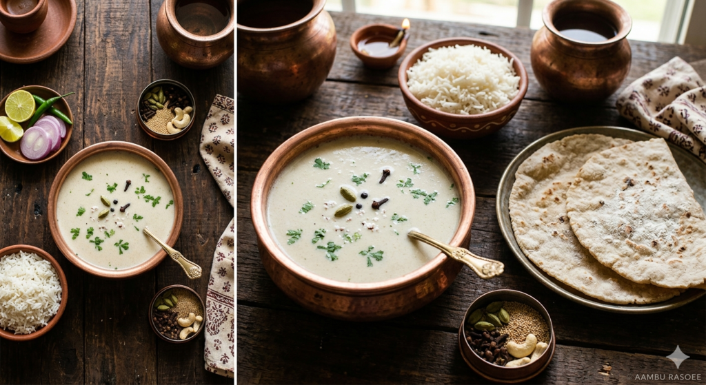Pandhra Rassa is a legendary white gravy from Kolhapur, Maharashtra. Known for its velvety texture and aromatic richness, this dish
