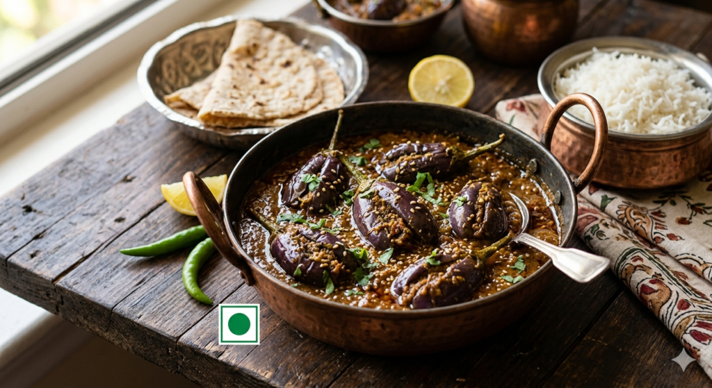Bharli Vangi is a traditional Maharashtrian dish where baby eggplants are stuffed with a spicy, nutty, and tangy peanut-coconut mixture.