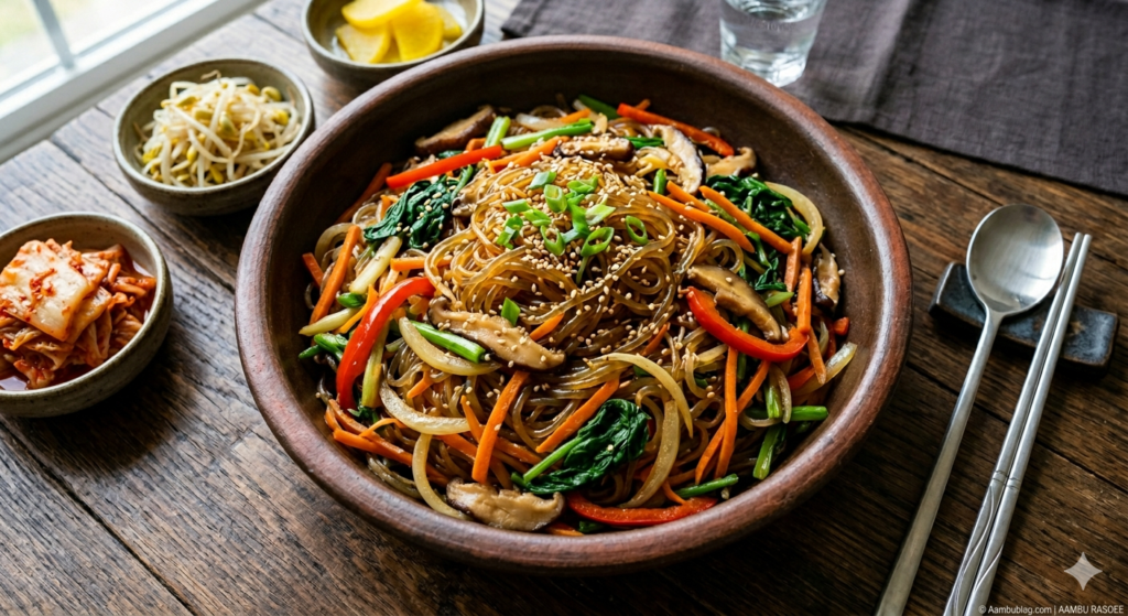 Dietary Category: Vegetarian Symbol: 🟢 (Green Circle for Veg) Japchae (잡채) is a classic Korean dish made with sweet potato